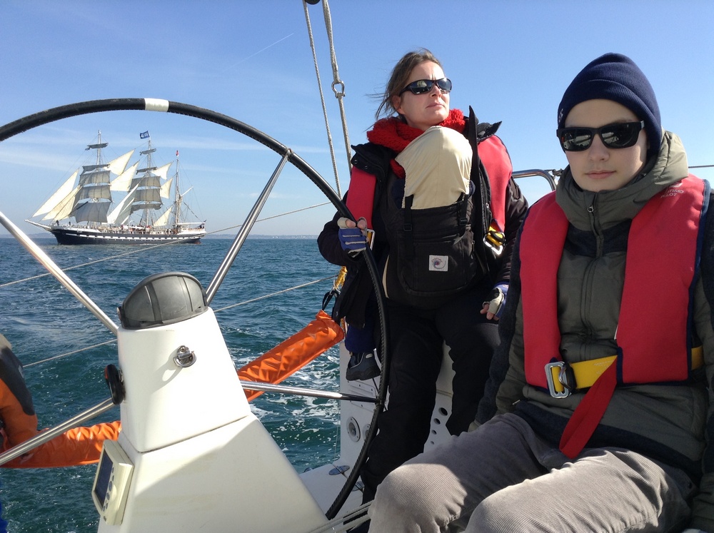 22.04.2015 3 Wochen schönes Wetter in der Bretagne Loïck segelt mit Familie (Katja am Steuer), im Hintergrund die "Belem"